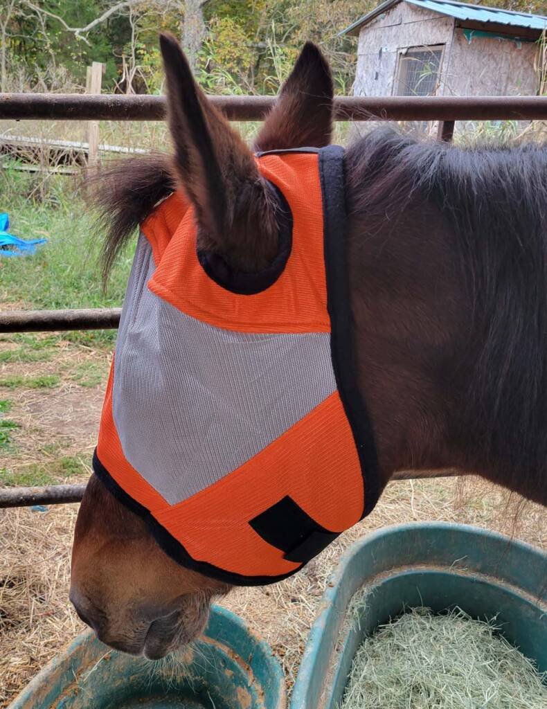 I spent some time with the senior mare this afternoon working on grooming her and replacing her regular fly mask for one that is in high vis orange. And as I was working with her, I thought about how this translates into horse wisdom, and how it is important to be visible. Here in the Ozarks we’re moving into hunting season, and while my horses are fairly safe (I know my neighbors; they’re careful around livestock) there’s also the chance that someone new might be in the area, and a bit of blaze orange is a great safety device.